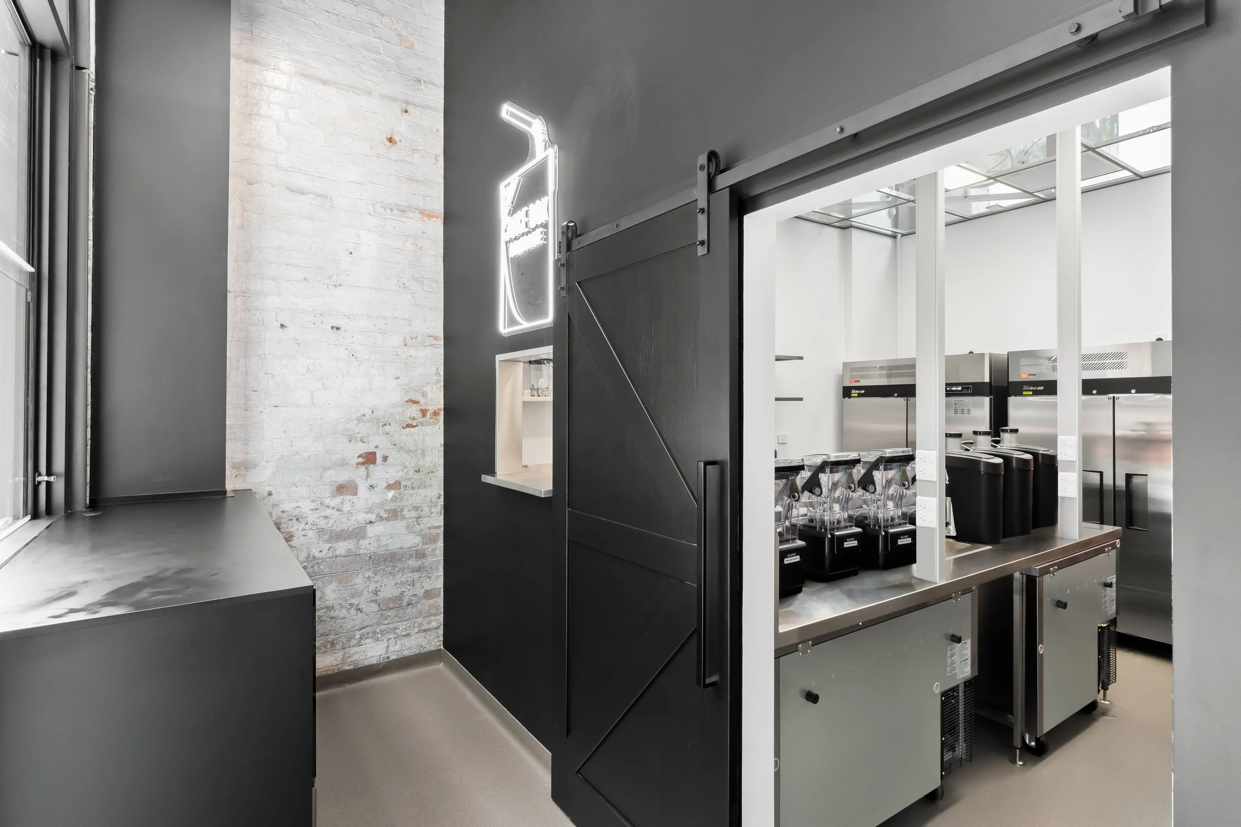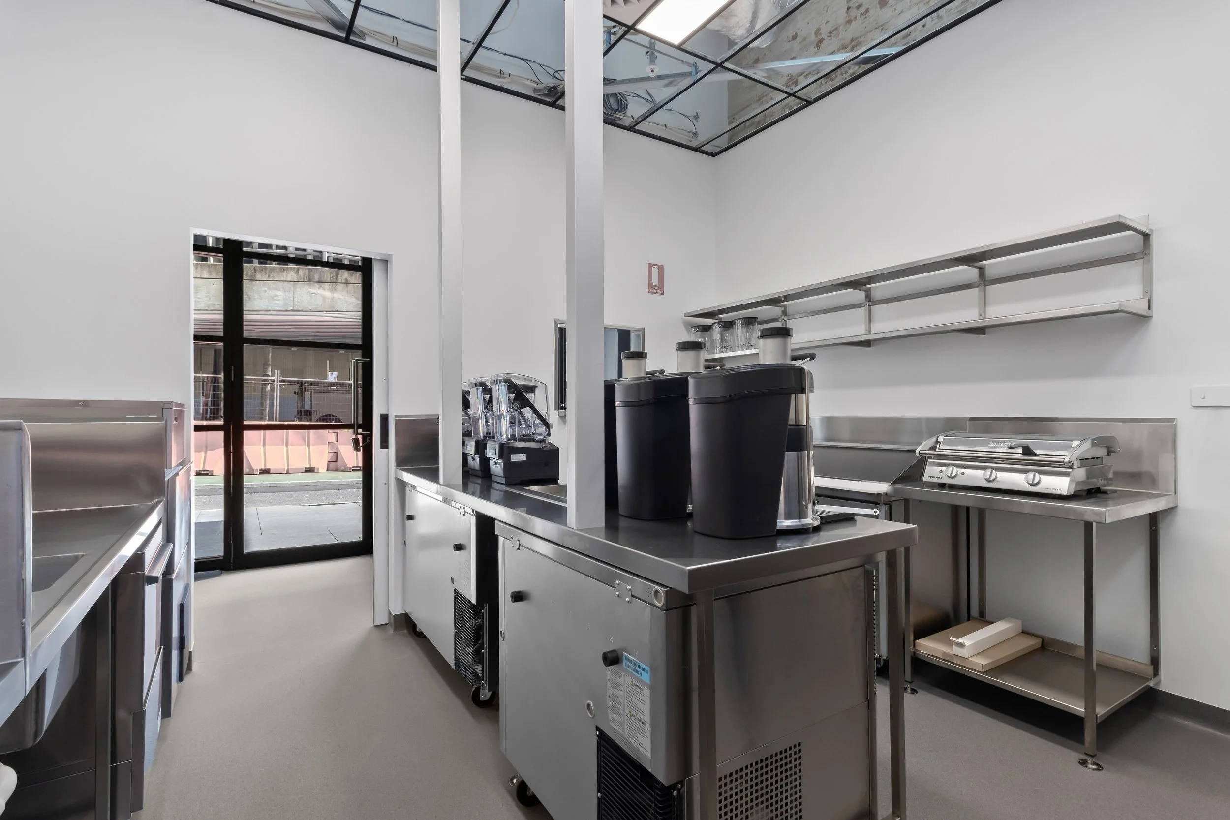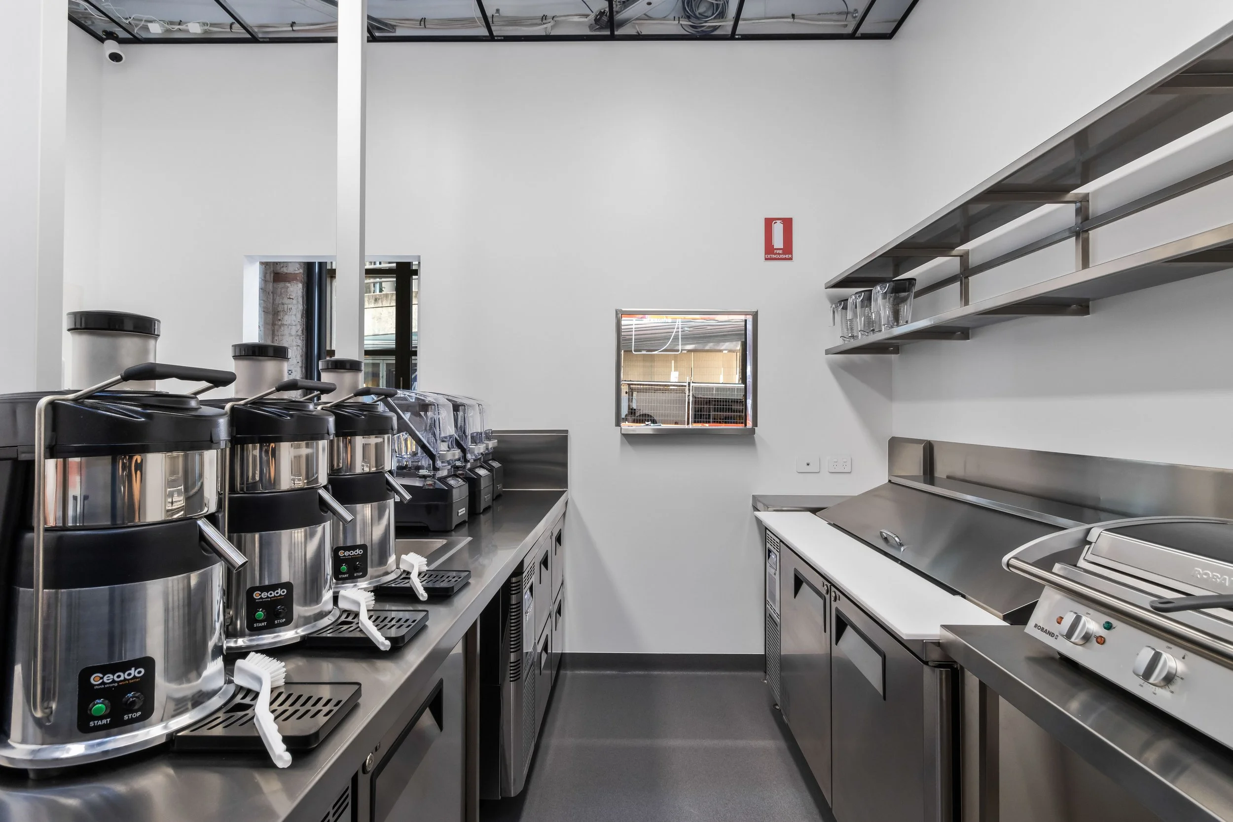 While aesthetics took the spotlight up front, functionality ruled the back. Maintaining a clean and efficient workspace stood as a top priority for the Juice Box team. The transparent ceiling tiles brighten the area, welcoming natural light and revealing the impressive 5.2m high ceilings that stretch throughout. Amidst the stainless steel landscape, an array of appliances ensures a seamless flow of delicious food and refreshing juices!