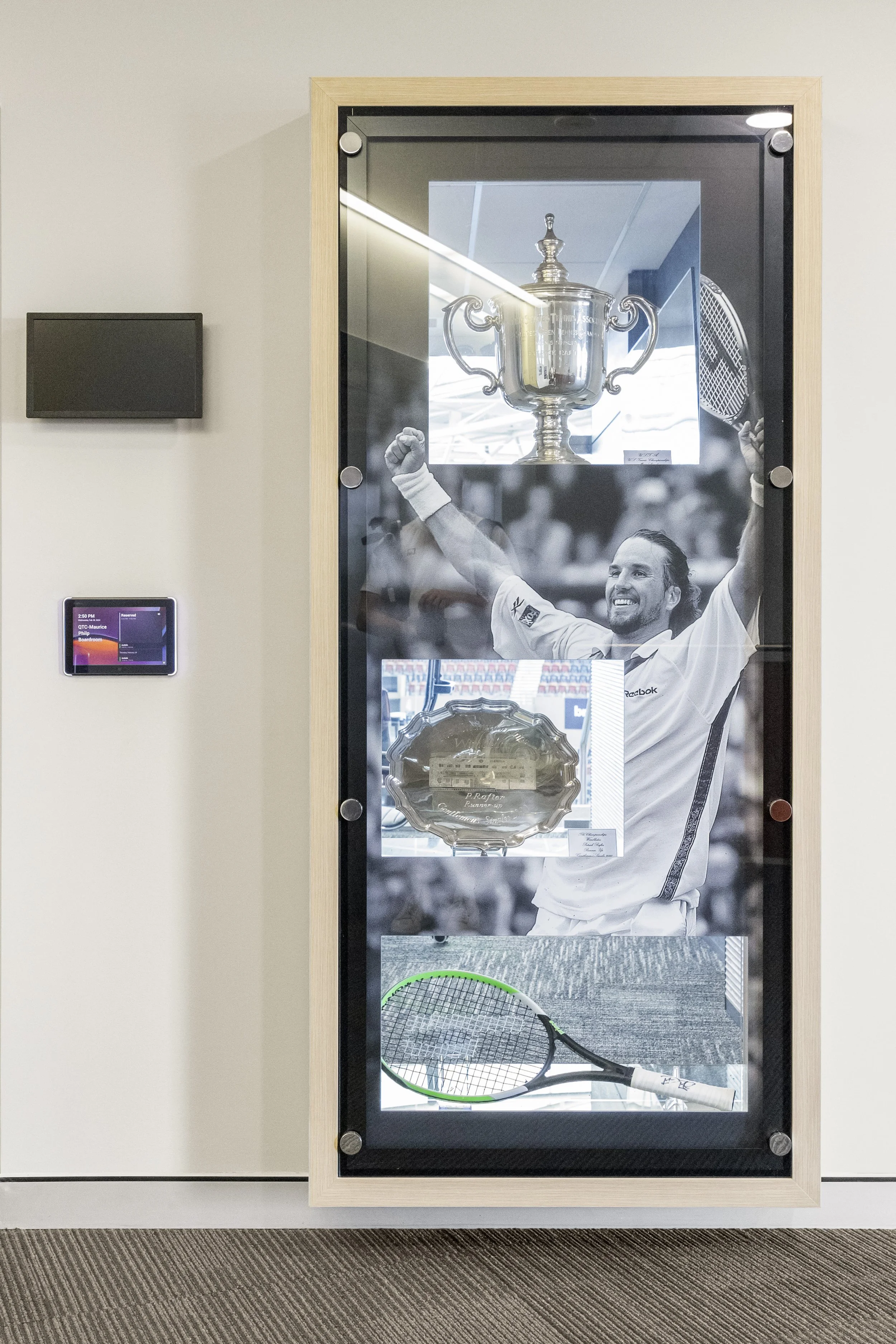 To enhance the functionality of the suite, an operable wall has been installed as part of the upgrades. This addition allows for the space to be opened up, extending the adjoining area, especially beneficial for events like the Brisbane International hosted by QTC. Careful attention has been paid to the aesthetics of these upgrades. Notably, the operable wall features a tennis ball detail on the interior, adding both functional and aesthetic relevance to the space.